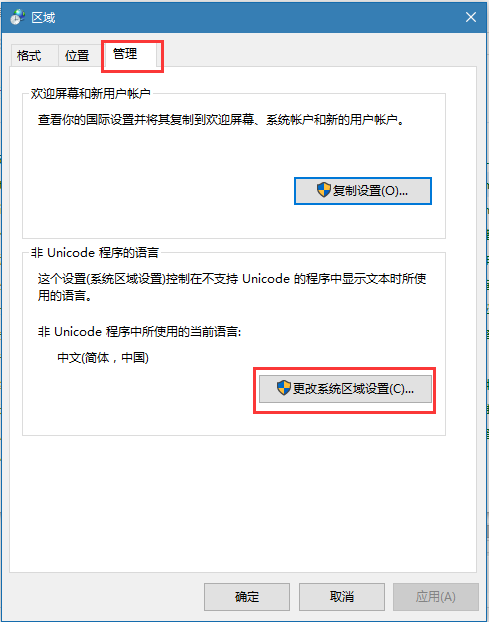 3、在彈出的窗口中選擇“管理--更改系統區域設置”,如下圖:
