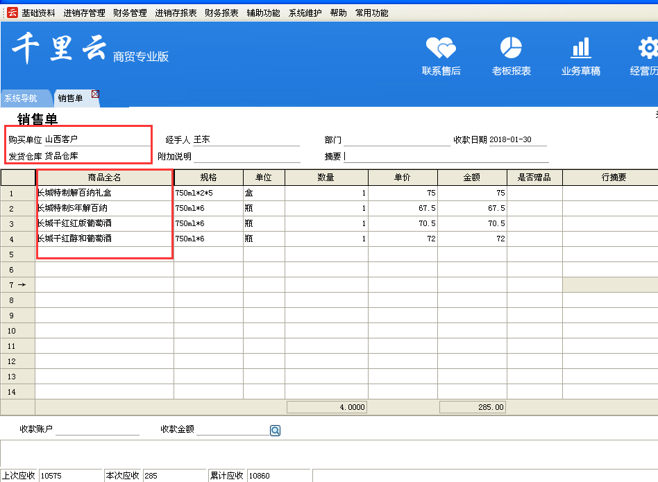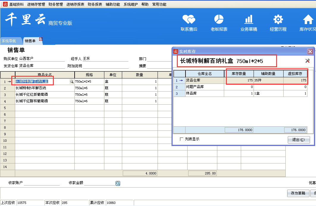 4、在銷售單查看實時庫存,可以即時方便的了解庫存狀況,快速開單;除銷售單可以查看實時庫存以外,也可以在進貨訂單、進貨單、銷售訂單等單據上查看。 5、如需更多應用方法,請咨詢千里云進銷存財務倉庫管理軟件官方 電話028-86565655。 |